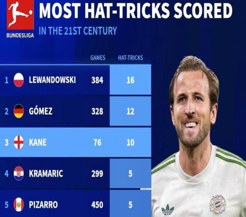 本世紀德甲戴帽數(shù)前10:萊萬384場16次第1,凱恩76場10次第3